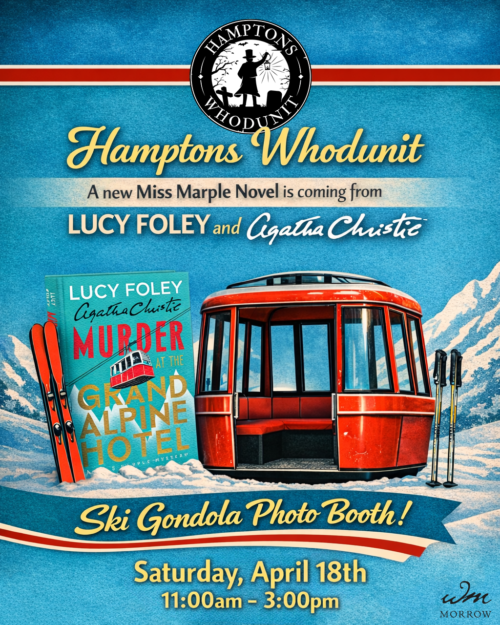 On Saturday, April 18, from 11am to 3pm outside Hoie Hall, Hamptons Whodunit attendees can step inside the world of the book with a ski gondola photo opp! Get your picture taken and learn more about this new Miss Marple mystery. The first twenty attendees in line will receive an advance copy of MURDER AT THE GRAND ALPINE HOTEL, and Hamptons Whodunit passholders will also receive an exclusive excerpt from the book delivered straight to their inboxes after the festival.